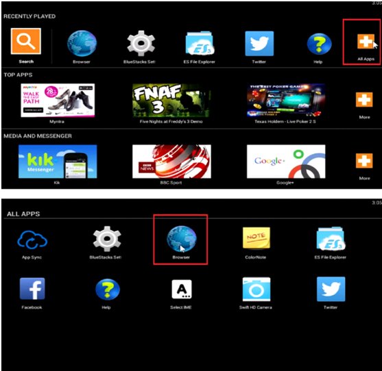 The BlueStacks dashboard will open up after logging in. Use the top navigation menu to go to All Apps >> Browser.